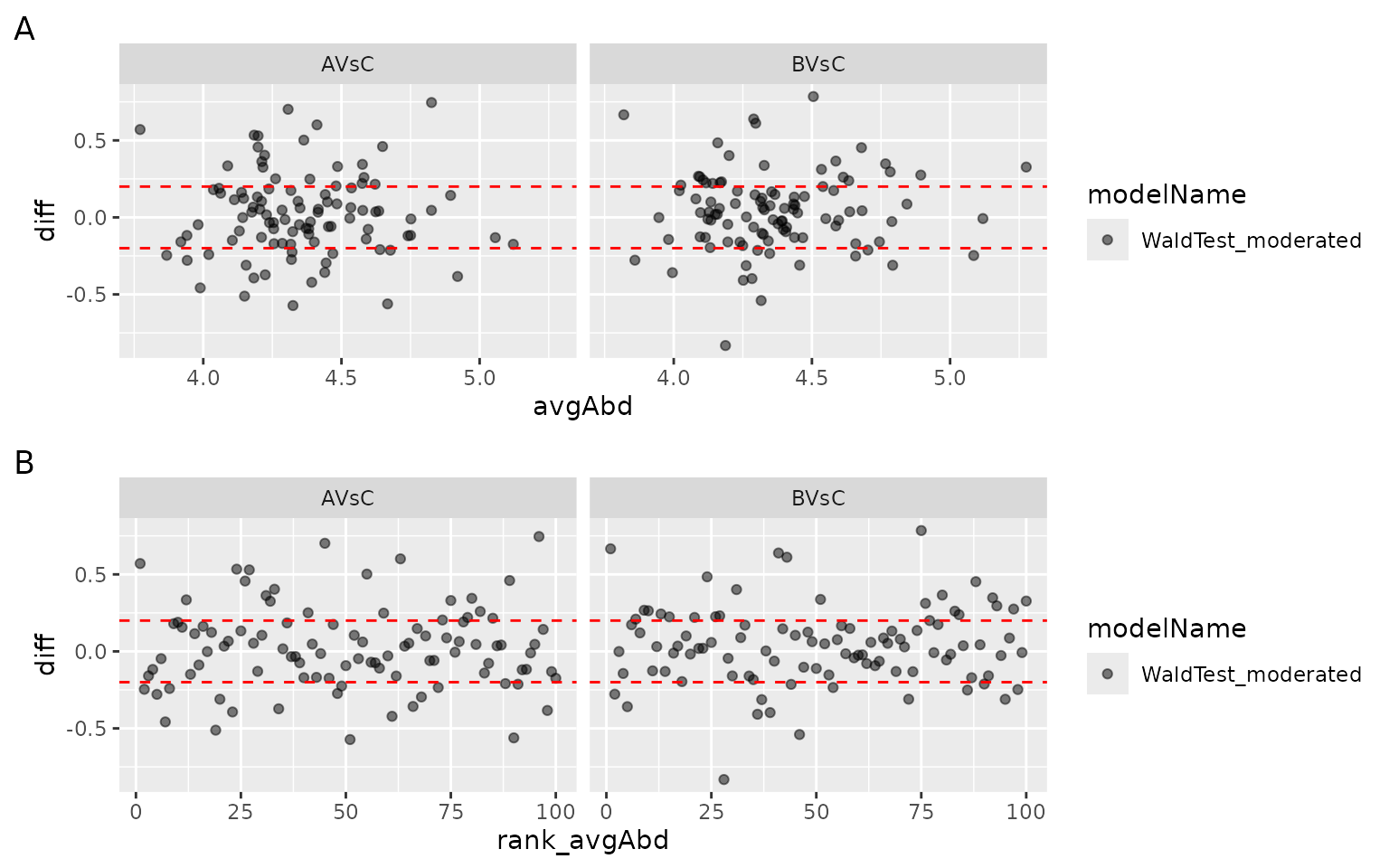 (ref:MAPlot) MA plot: x - axis: average protein abundance (Panel A) or rank of average protein abundance (Panel B), y - axis: difference between the groups.