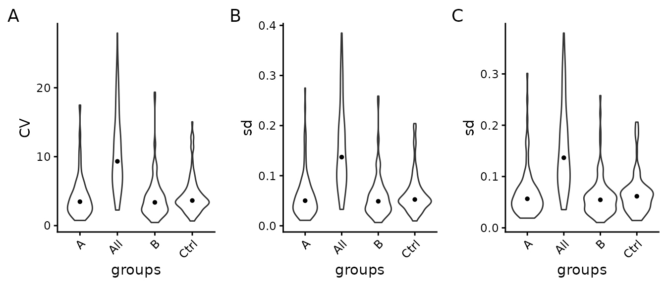 The left panel A of Figure @ref(fig:SDViolin), shows the coefficients of variations (CV) for all proteins computed on not normalized data. Ideally, the within-group CV should be smaller than the CV of all samples. Panel B of Figure @ref(fig:SDViolin) shows the distribution of the standard deviation for all proteins of log2 transformed data, while the right panel C of Figure @ref(fig:SDViolin) shows it for normalized data. We expect that within-group variance is decreased by data normalization compared with the overall variance (all). However, if normalization increases within group variance compared to overall variance, this indicates an incompatibility of the normalization method and the data.