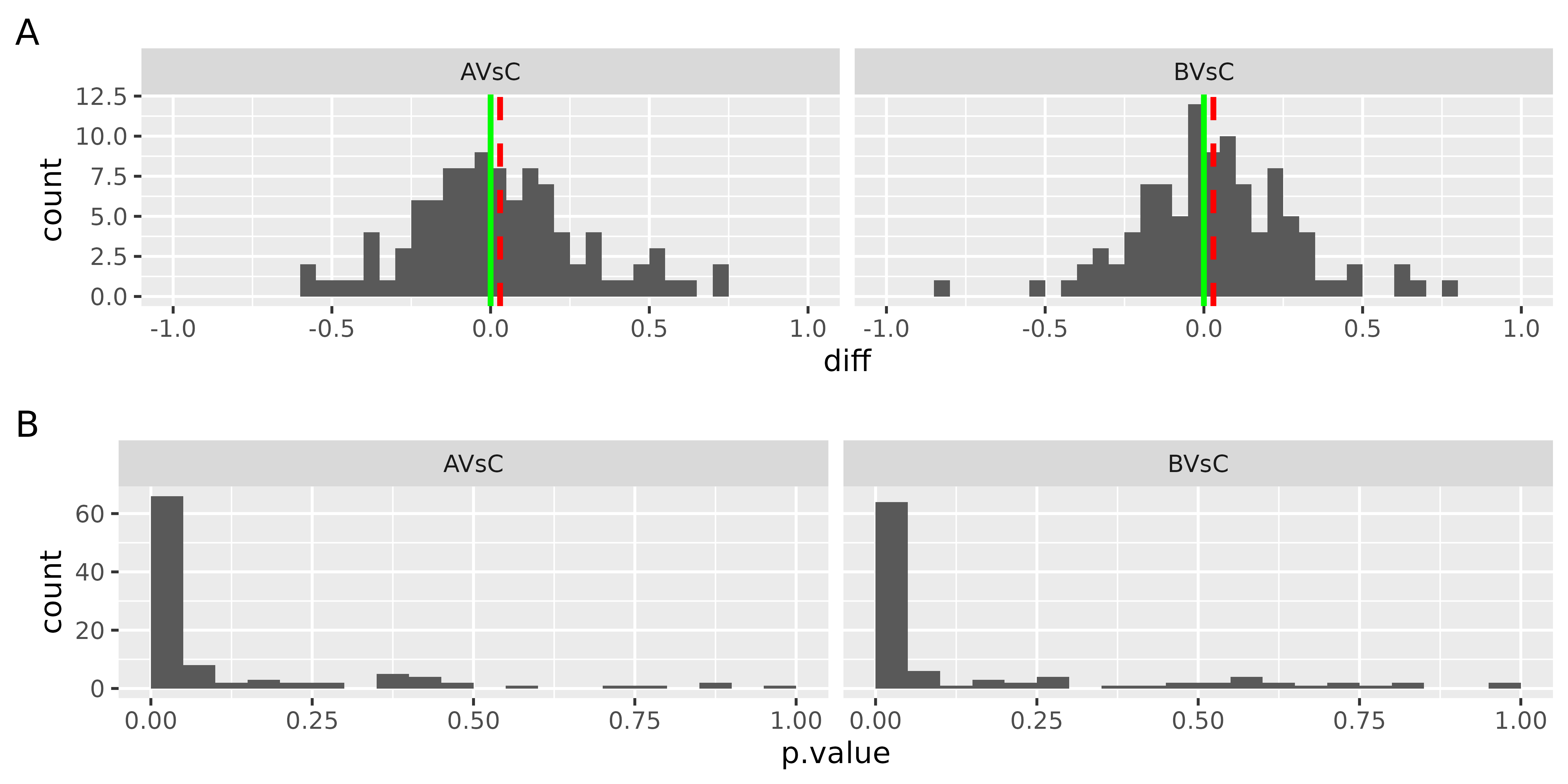 Typically most of the datasets’ proteins are not differentially expressed, i.e., the differences between the two groups should be close to zero. Figure @ref(fig:densityOFFoldChanges) shows the distribution of differences between the groups for all the proteins in the dataset. Ideally, the median of this distribution (red line) should equal zero (green line). If the median and mode of the difference distribution are non zero, this should be considered when interpreting the differential expression analysis results.