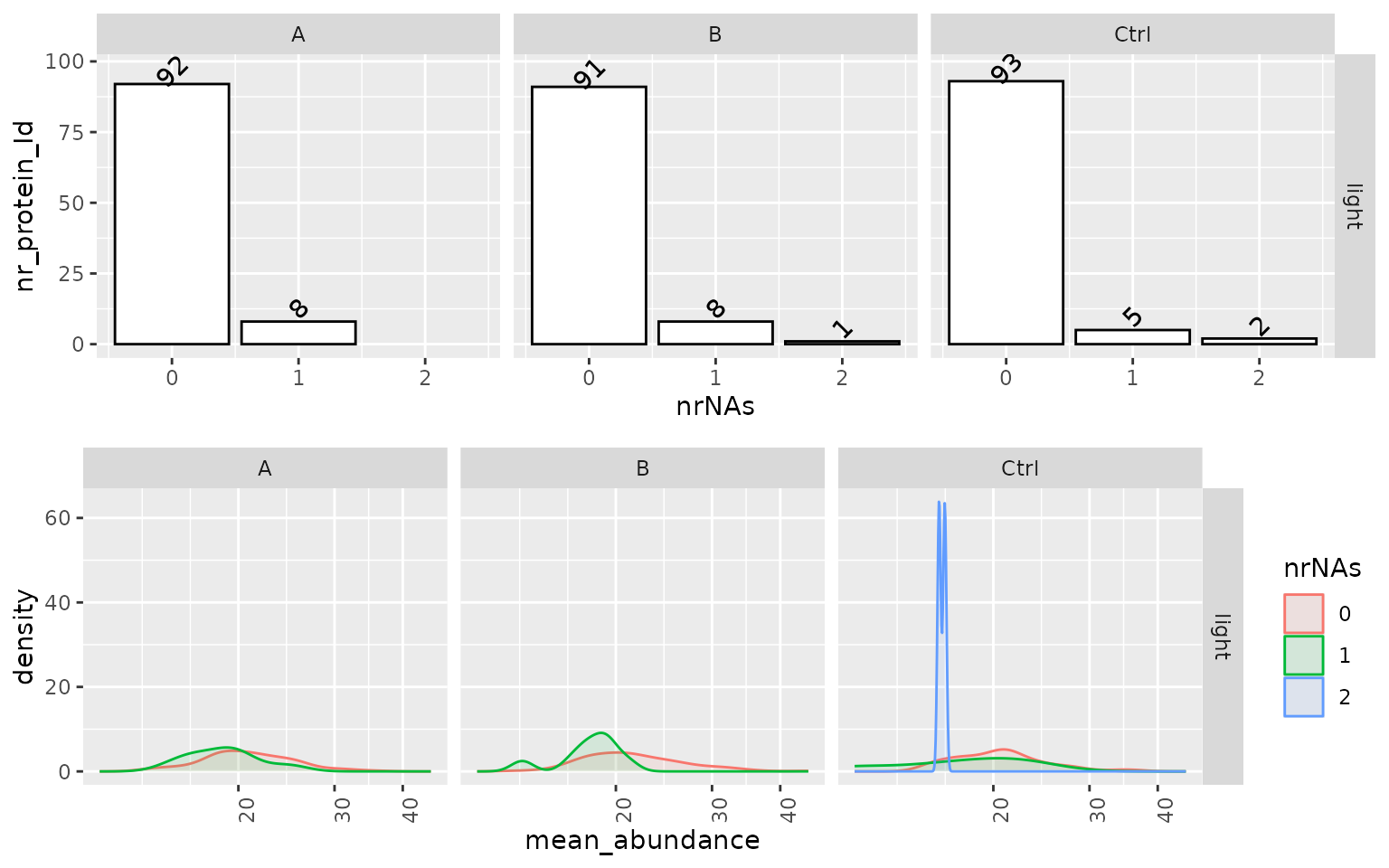 The analysis of missing values can be an essential indicator of potential problems and biases in the data. We, therefore, visualize the structure of missing values (missing protein abundance estimate per protein) using various plots. Figure @ref(fig:missingProtein) left panel shows the number of proteins (y) axis with missing values (x-axis) in each group. Ideally, a protein should be observed in all samples within a group (zero missing values). The density plot on the right panel (Figure @ref(fig:missingProtein)) shows the distribution of the mean protein intensity within a group, given missing values. Usually, proteins with zero missing values have a higher average abundance than those with one or more missing values because low abundant proteins might not be detected in some samples. However, if these distributions strongly overlap, this points to a different source of missingness, e.g., large sample heterogeneity or technical problems.