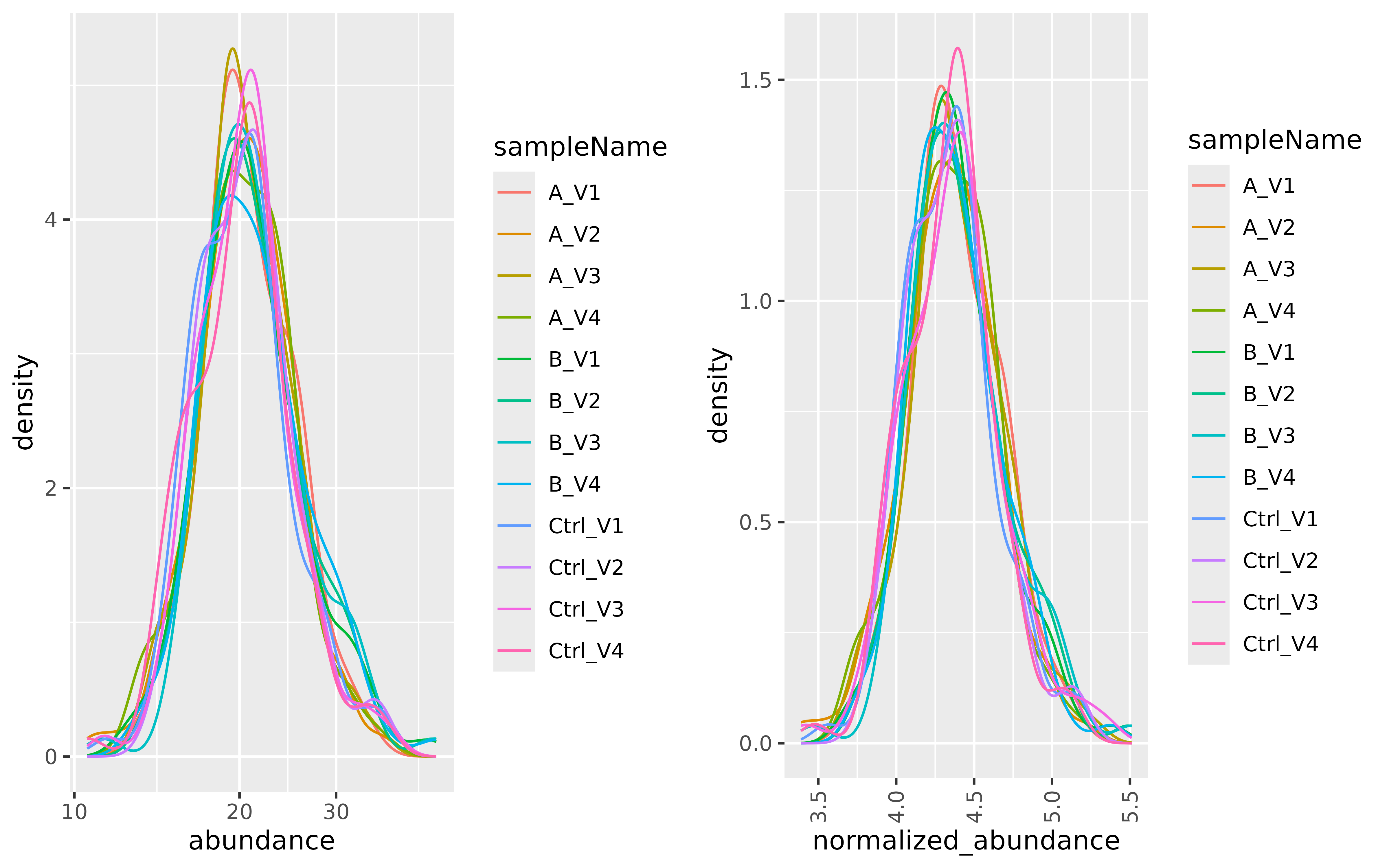 (ref:normalized) Kernel density function showing the distribution of protein abundances in all samples. Left panel: Empirical protein abundance of all samples in the dataset. Right panel: Normalized empirical protein abundances of all samples in the dataset.