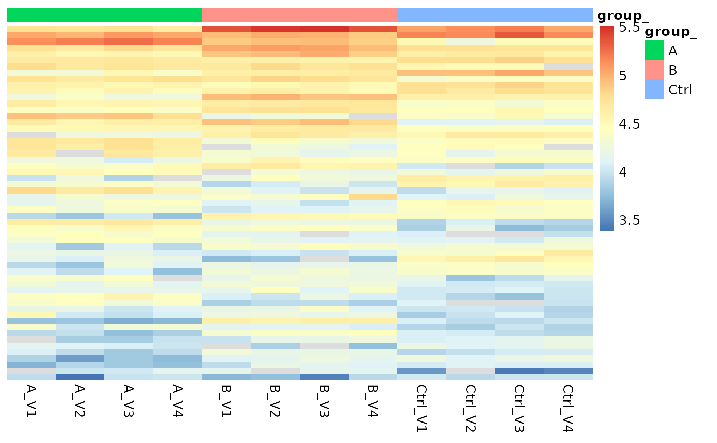 Furthermore, Figure @ref(fig:sigroteins) shows a heatmap of log2 transformed protein abundances of all significant calls.