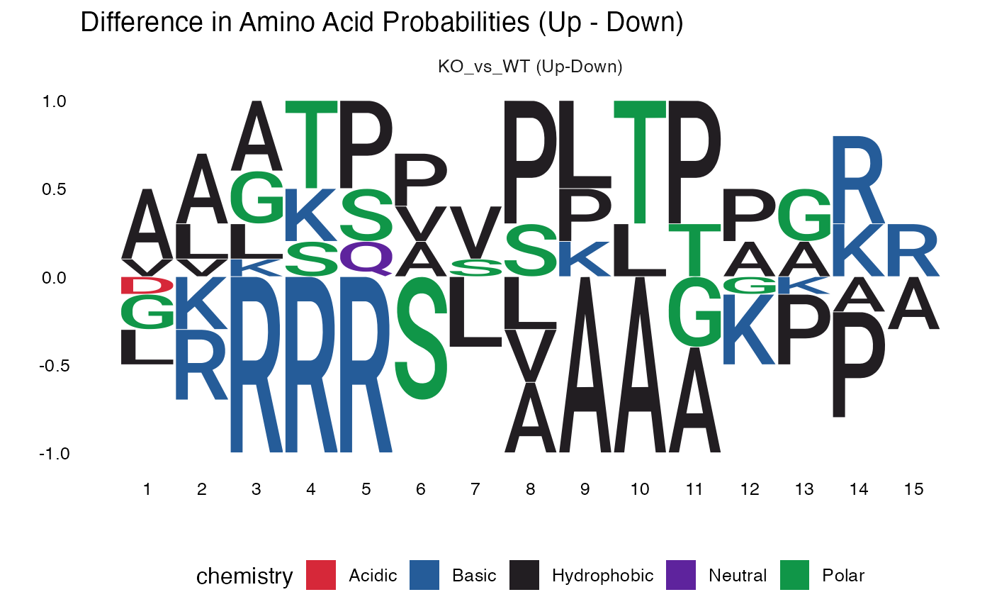 Creates a difference sequence logo plot that visualizes the difference in amino acid frequencies between upregulated and downregulated phosphorylation sites. This visualization helps identify kinase-specific motifs that are differentially regulated between experimental conditions.